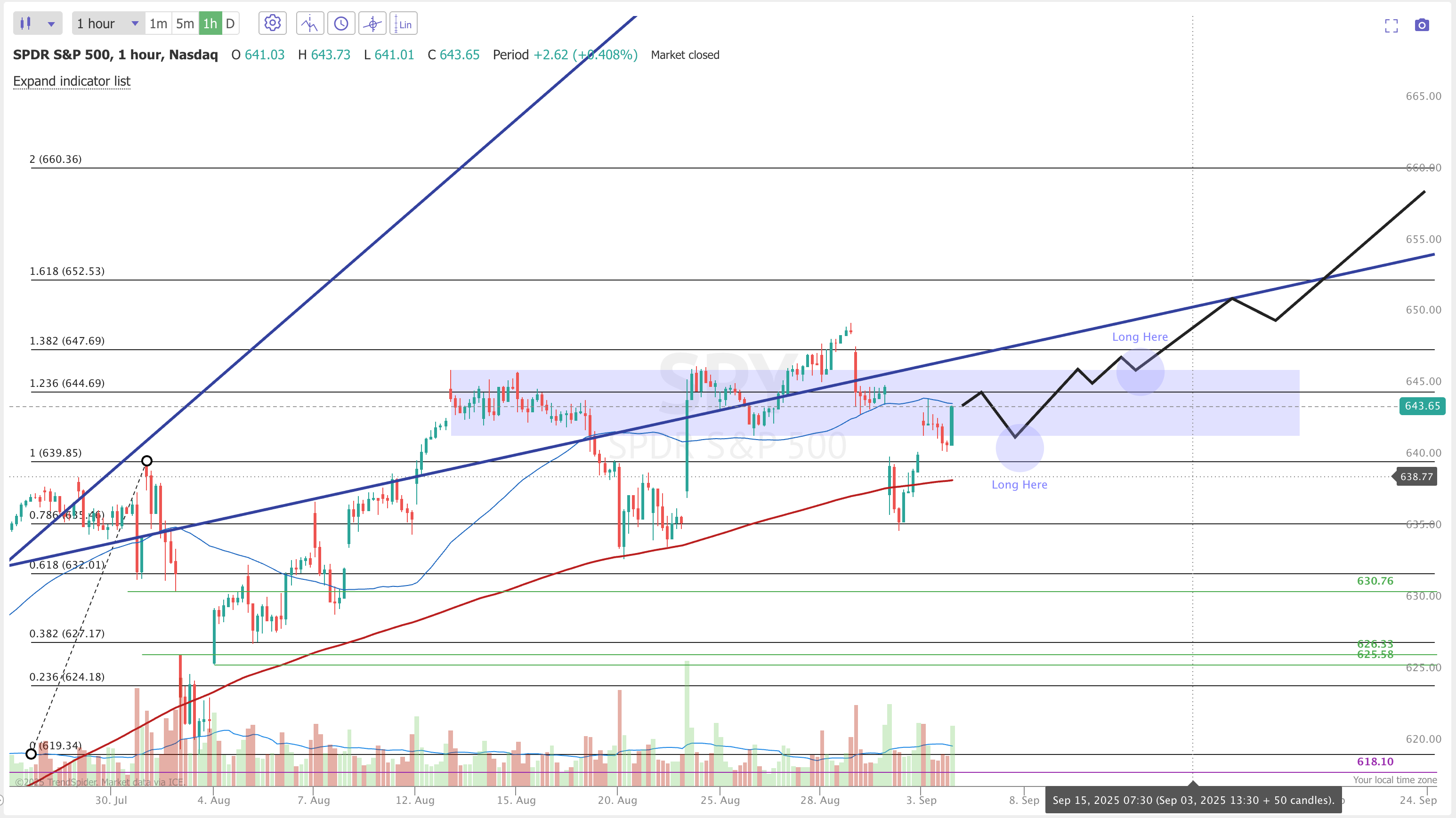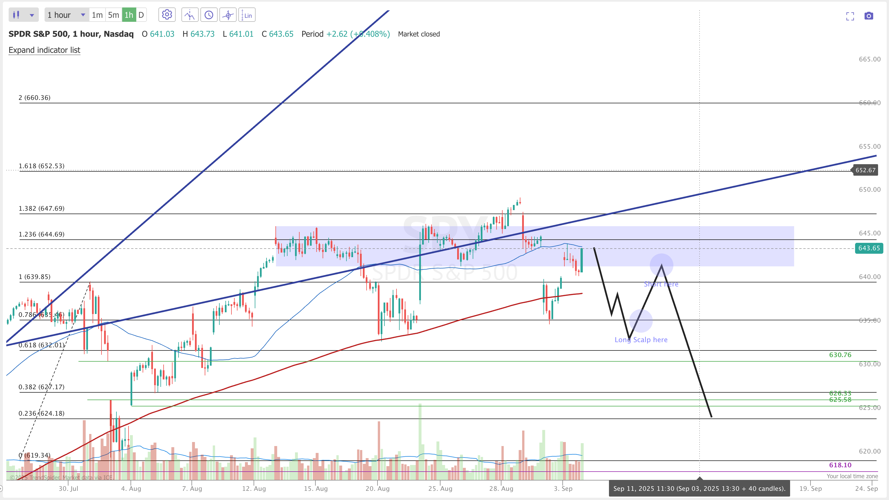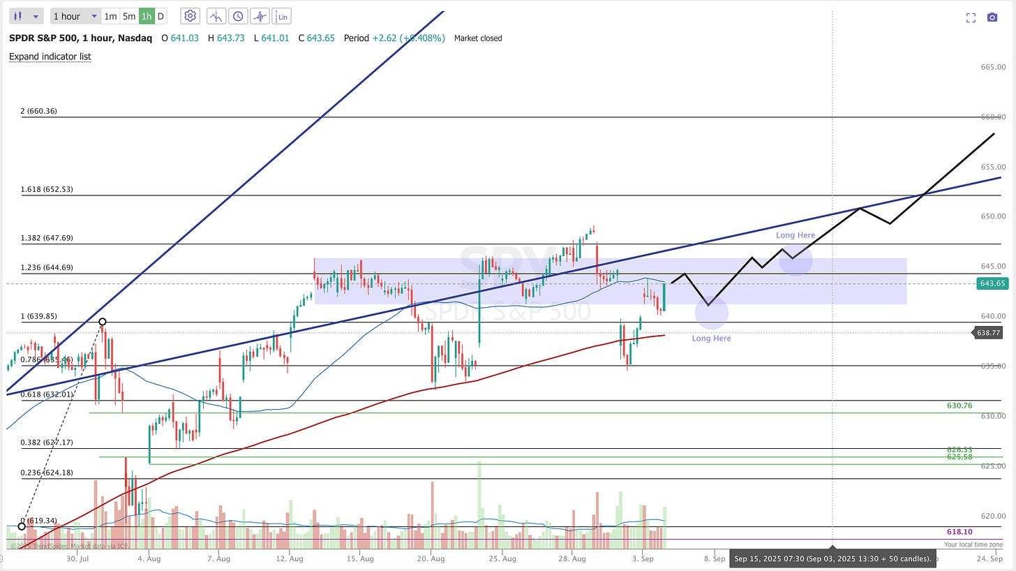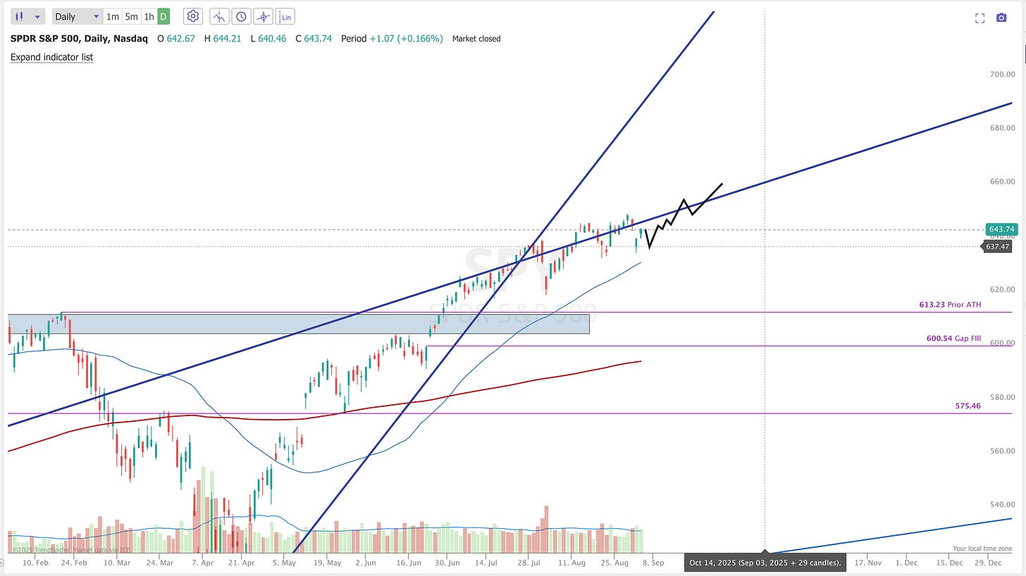 Now I’m finally updating the plan after three weeks of it tracking pretty well. The main update here is based around seasonality and is not a suggestion to short. While I still believe that there is more upside left to 660(ish), seasonality generally has September as a down month so I’m cautious here. On Friday I alerted that I sold covered calls against half of my long shares portfolio as a hedge in case we get some volatility into September. What I would love to see play out is one final push to 660 in the next 1-2 weeks and then we can short SPY into Sep OPEX for an end of month correction.